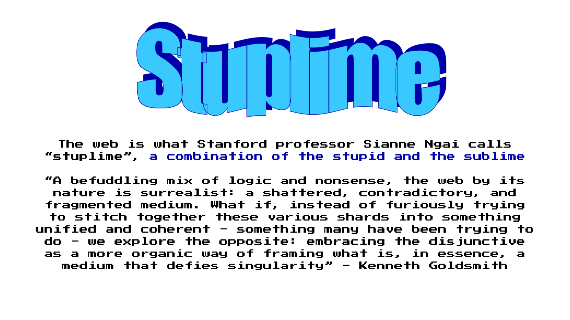 We were inspired by Kenneth Goldsmith’s book, Wasting Time on the Internet, which forefronts the positive nature of the internet as a fractured but exciting new way of communicating and a surreal or ‘stuplime’ platform for creativity. Somewhere between stupid and sublime, the internet could link us across the world, enabling us to share resources and collaborate peer to peer in a creative way. Or it could be our downfall, generating a species of zombies born of the omniscient ‘work-core’ virus, evolved to do nothing but grind and consume.